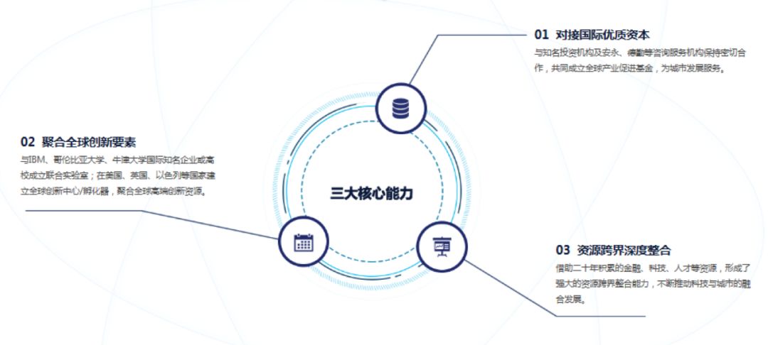 目前这三类产品在国内都有落地。科技园包括在武汉的华中金融科技港、佛山的鑫创AI科创智谷,这类项目占地500亩左右,重点发展楼宇经济;科技小镇有郑州的中原创客小镇、大连的鑫创国际健康科技小镇、湖州的丝绸小镇等;科技新城项目,目前主要为布局在武汉长江新城的未来科技新城和西安的白鹿原影视科技新城。第二个“3”是我们着力打造的三大核心竞争力。这三个能力已在逐渐形成,未来两年,我们要达到至少不落后标杆企业的标准。